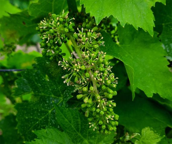 Im Frühsommer ist es dann soweit: ,,Der Wein blüht‘‘. Die Blüttenkäppchen werden abgeworfen und die Entwicklung der Beeren kann beginnen.