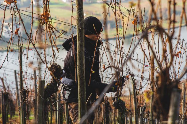 Um die Grundlagen für ein erfolgreiches Weinjahr zu legen, wird jeder Rebstock in den Wintermonaten zurückgeschnitten. Zurück bleiben maximal zwei kräftige Triebe, die im nächsten Schritt als Flach- oder Halbbogen im Drahtrahmen angebunden werden.